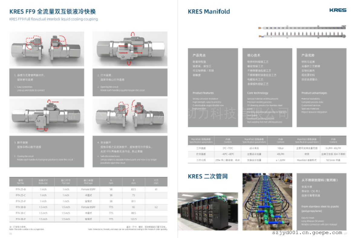 KRES的FF9快速接头设计用于数据中心机房冷却管路及电子冷却应用,在这些应用中,全流量,流体兼容性和安全性至关重要,